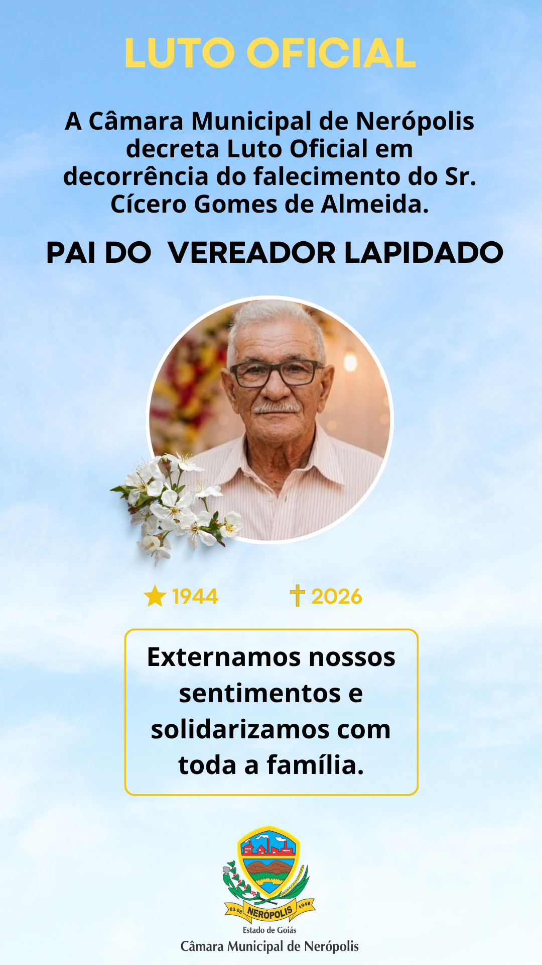 Fica decretado luto oficial por três dias, no âmbito do Poder Legislativo Municipal, em decorrência do falecimento do Sr. Cícero Gomes de Almeida,